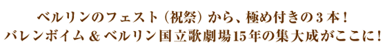 今回の3演目は、ベルリン国立歌劇場のもつ異なる魅力を多面的に発揮するという点で、ベストのプログラムといえます。2007年秋、バレンボイムとベルリン国立歌劇場15年の集大成をお見せします。 |