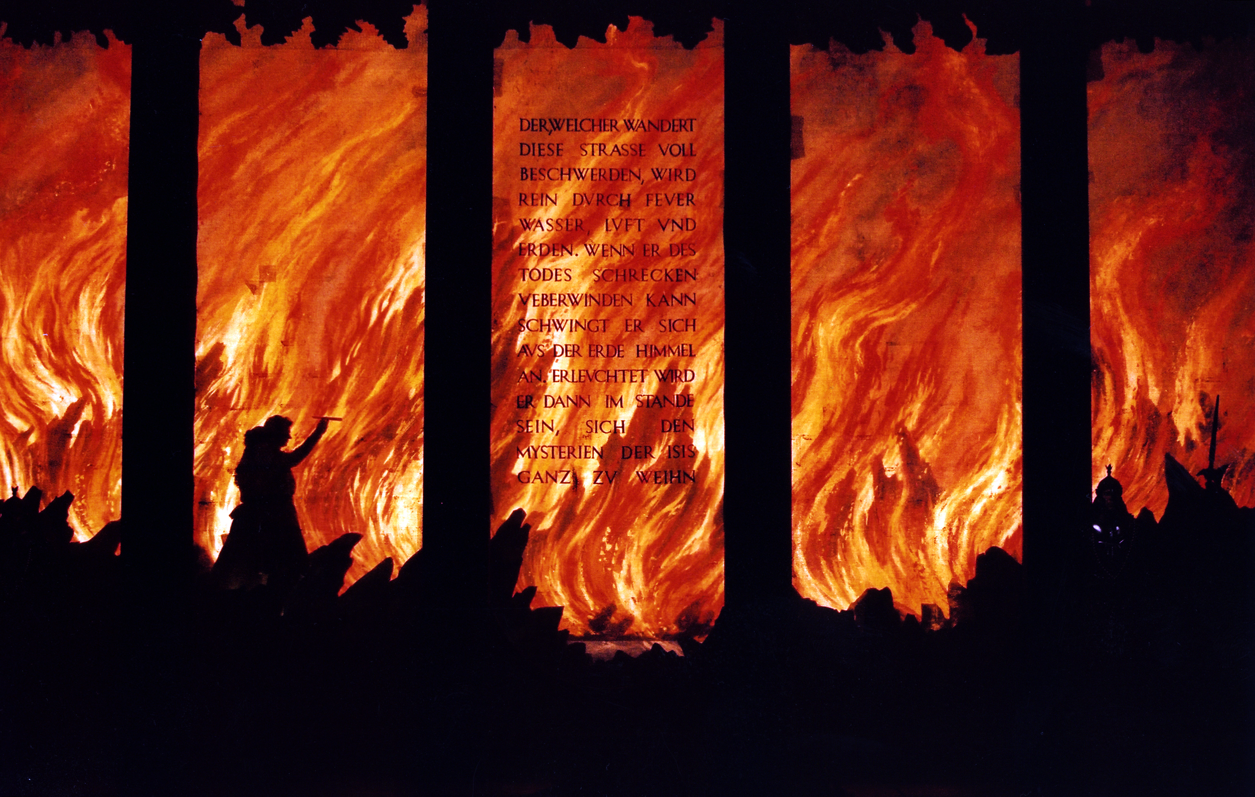 この演出の特徴としては最後のタミーノとパミーナによる火と水の試練の場面では大きな仕掛けがあるのですが、それ以外の場面では"幕だけで魅せることができる"という点が挙げられます。