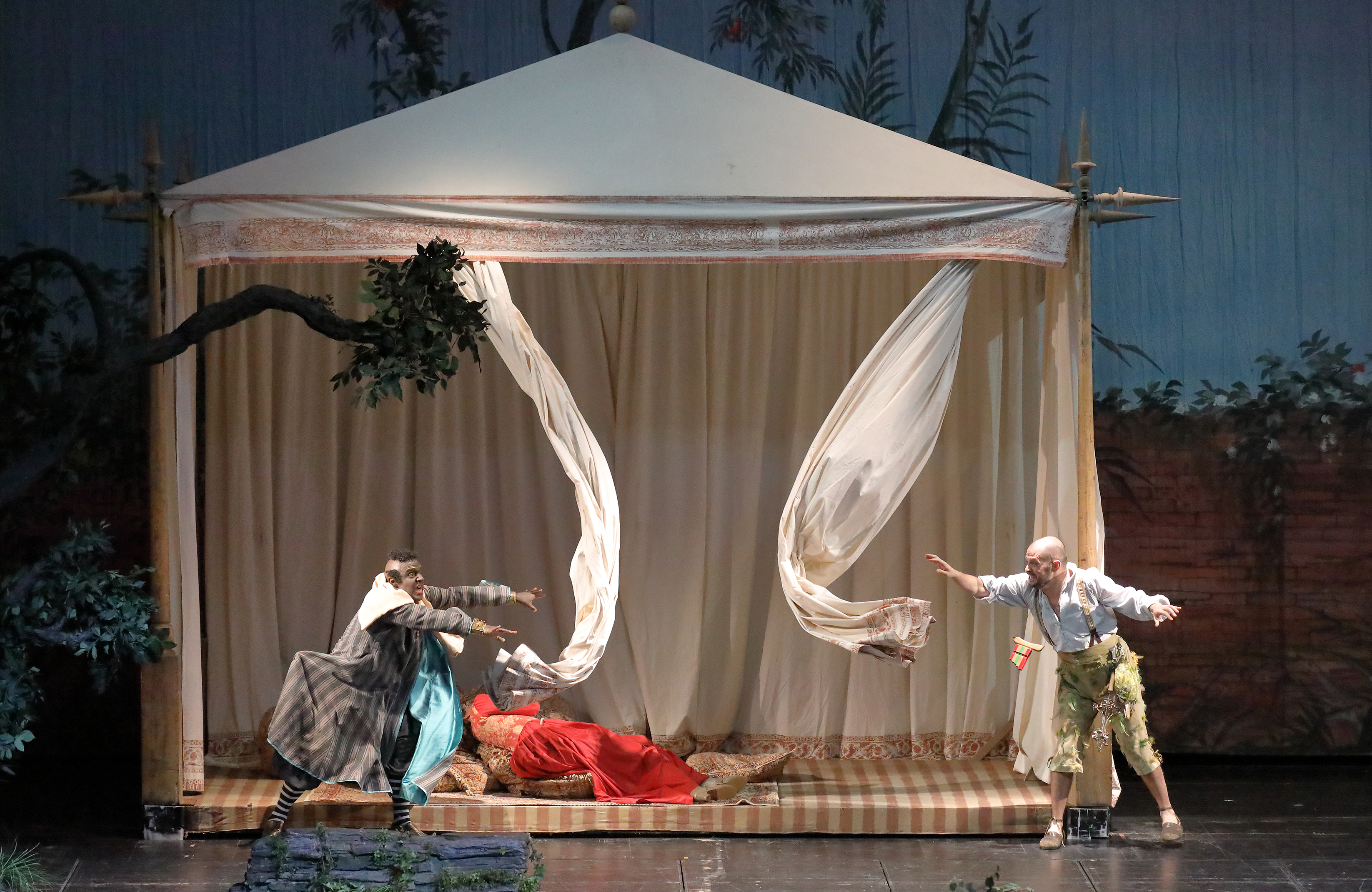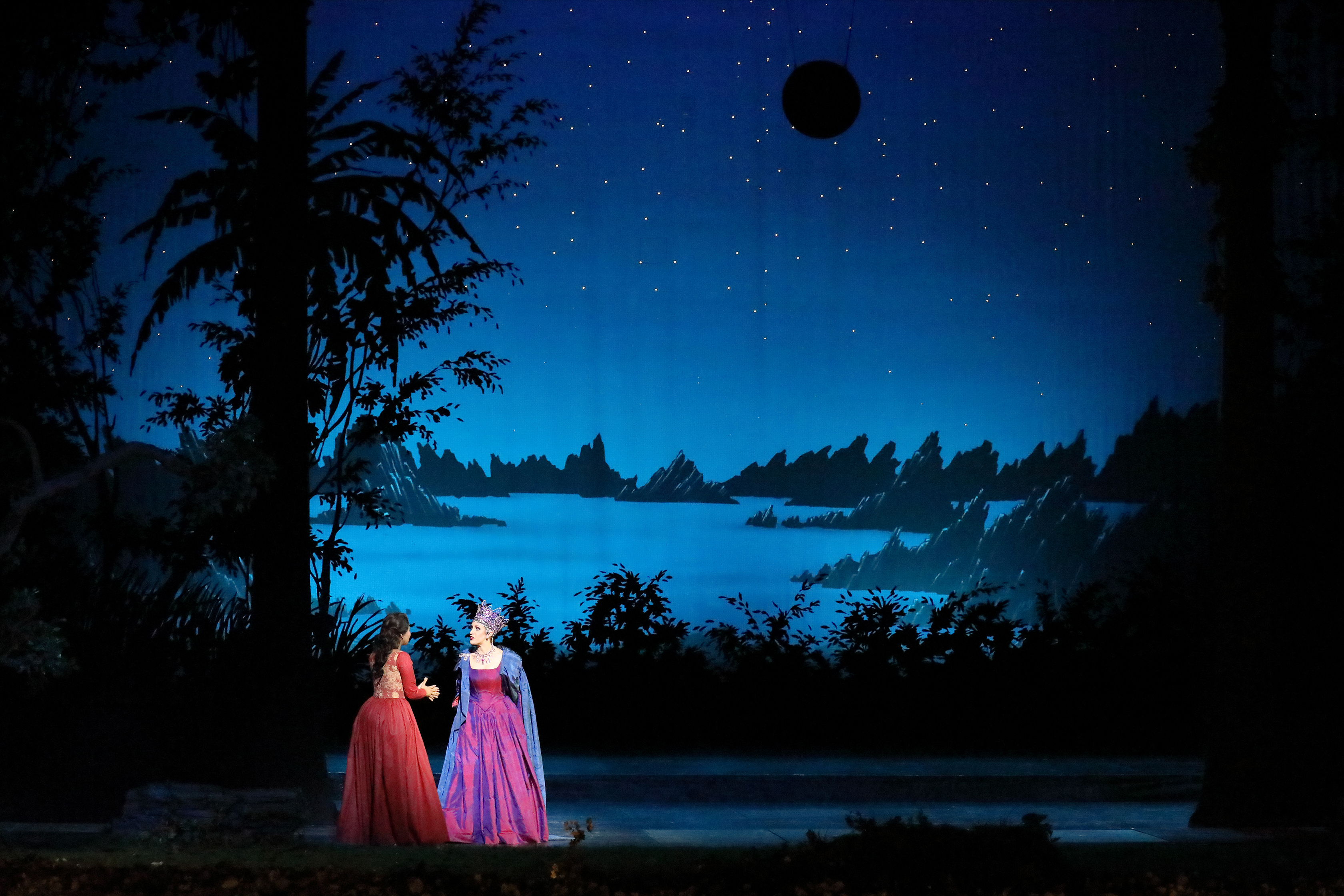 例えば、1幕で夜の女王が登場するシーン。客席からみると幕にライトがついていて、それが光っているようにみえます。今の演出ならばLEDライトをつけてそのようにするかもしれませんが、この演出では違います。小さな穴が無数にあいた幕を用意して、そのすぐ後ろに透ける白いスクリーンをたらします。そのスクリーンの後ろから光を当てると、穴から光がもれ、まるでライトがついているように輝きだすという仕掛けなのです。他にも、モノスタトスが寝ているパミーナに近づく場面では、彼の家来たちが後ろの幕をくるくるとまるめてもっていってしまうと、その後ろにパミーナがいたりと、ちょっとした幕の使い方で非常に効果的に魅せています。