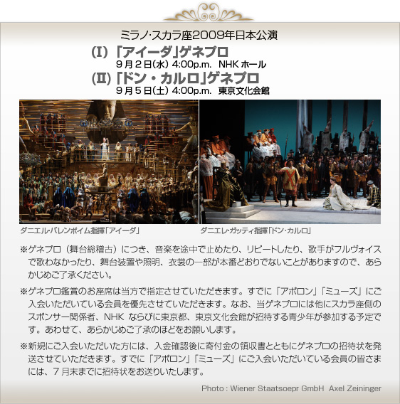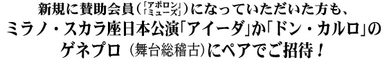 当財団の賛助会員には「パルナソス」(維持会員/年額1万円以上)、「ミューズ」(支援会員/年額5万円以上)、「アポロン」(特別会員/年額25万円以上)がありますが、今回「ミューズ」「アポロン」の会員になっていただきますと、下記の日時におこなわれる「アイーダ」か「ドン・カルロ」のいずれかのゲネプロに、ペアで(2名様)ご招待させていただきます。当財団へのご寄付をご検討されている方は、この機会にお申し込みいただきたく、ここにご案内申し上げます。