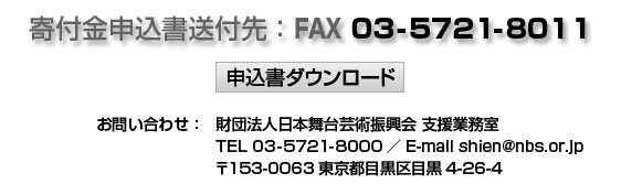 賛助会員のお申し込みは、下記よりの寄付金申込書をダウンロードの上、必要事項をご記入いただき、FAX(03−5721−8011)か郵送で下記NBSあて7月31日(金)までにお送りください。ご入会いただいた方には、後日、ゲネプロの招待状をお送りいたします。