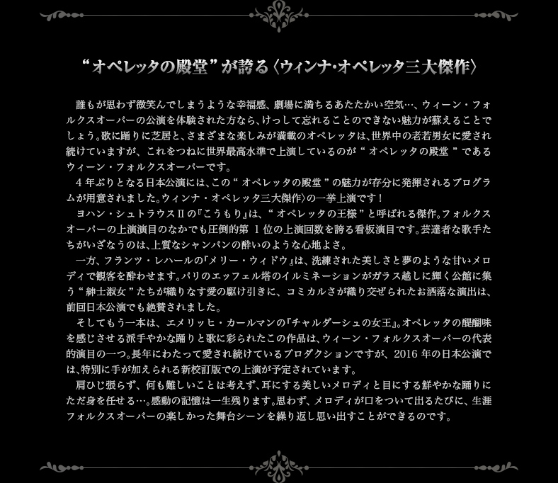 誰もが思わず微笑んでしまうような幸福感、劇場に満ちるあたたかい空気…、ウィーン・フォルクスオーパーの公演を体験された方なら、けっして忘れることのできない魅力が蘇えることでしょう。歌に踊りに芝居と、さまざまな楽しみが満載のオペレッタは、世界中の老若男女に愛され続けていますが、これをつねに世界最高水準で上演しているのが“ オペレッタの殿堂”であるウィーン・フォルクスオーパーです。 4 年ぶりとなる日本公演には、この“ オペレッタの殿堂”の魅力が存分に発揮されるプログラムが用意されました。ウィンナ・オペレッタ三大傑作〉の一挙上演です! ヨハン・シュトラウスⅡの『こうもり』は、“ オペレッタの王様”と呼ばれる傑作。フォルクスオーパーの上演演目のなかでも圧倒的第1 位の上演回数を誇る看板演目です。芸達者な歌手たちがいざなうのは、上質なシャンパンの酔いのような心地よさ。 一方、フランツ・レハールの『メリー・ウィドウ』は、洗練された美しさと夢のような甘いメロディで観客を酔わせます。パリのエッフェル塔のイルミネーションがガラス越しに輝く公館に集う“紳士淑女”たちが織りなす愛の駆け引きに、コミカルさが織り交ぜられたお洒落な演出は、前回日本公演でも絶賛されました。 そしてもう一本は、エメリッヒ・カールマンの『チャルダーシュの女王』。オペレッタの醍醐味を感じさせる派手やかな踊りと歌に彩られたこの作品は、ウィーン・フォルクスオーパーの代表的演目の一つ。長年にわたって愛され続けているプロダクションですが、2016 年の日本公演では、特別に手が加えられる新校訂版での上演が予定されています。 肩ひじ張らず、何も難しいことは考えず、耳にする美しいメロディと目にする鮮やかな踊りにただ身を任せる…。感動の記憶は一生残ります。思わず、メロディが口をついて出るたびに、生涯フォルクスオーパーの楽しかった舞台シーンを繰り返し思い出すことができるのです。
