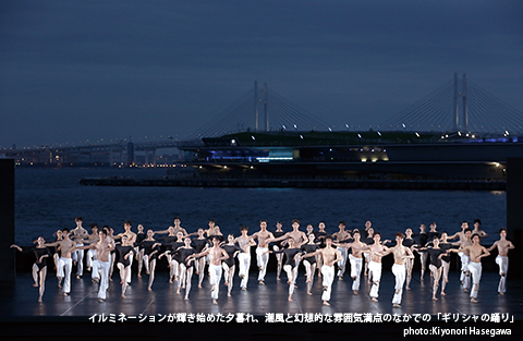 上演中に舞台の後方にクルーズ船が行き交ったり、遠く警笛が聞こえるのも、この催しならでは。昼間の暑さは夕暮れとともに和らぎ、舞台からの熱気と海風が満席の観客を心地よくさせました。