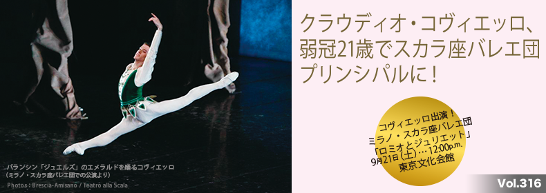 今秋のミラノ・スカラ座バレエ団日本公演「ロミオとジュリエット」9月21日(土)昼公演でロミオを演じるクラウディオ・コヴィエッロが、去る5月4日、ミラノ・スカラ座において、「ジゼル」のアルブレヒトを演じた後、弱冠21歳でプリンシパルに任命されました。