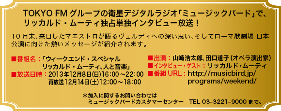 TOKYO FMグループの衛星デジタルラジオ「ミュージックバード」で、リッカルド・ムーティ独占単独インタビュー放送! 10月末、来日したマエストロが語るヴェルディへの深い思い、そしてローマ歌劇場日本公演に向けた熱いメッセージが紹介されます。 ■番組名:「ウィークエンド・スペシャル リッカルド・ムーティ、人と音楽」 ■放送日時:2013年12月8日(日)16:00~22:00 再放送12月14日(土)12:00~18:00 ■出演:山崎浩太郎、田口道子(オペラ演出家) ■インタビュー・ゲスト:リッカルド・ムーティ ■番組URL : http://musicbird.jp/programs/weekend/ *加入に関するお問い合わせは ミュージックバードカスタマーセンター TEL 03–3221–9000まで。