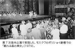 こうして世界水準の舞台に触れる数々の機会を創出しながら、1979年の第7次海外公演では、ついにモスクワのボリショイ劇場への出演がかなったのです。200年以上の伝統を誇る世界最高峰の劇場への出演は、日本のバレエ団初の快挙として注目され、「レ・シルフィード」「タムタム」を含む〈ミックス・プロ〉、「眠れる森の美女」全幕、さらに、アレクセイ・ワルラーモフに振付を委嘱、ボリショイのスタッフと共同制作し、前年に初演した「かぐや姫」を上演。連日超満員、カーテンコールでは客席総立ちという大成功を収め、その大いなる発展を強く印象づけたのでした。