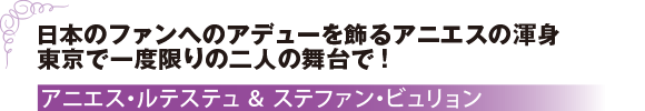 アデュー公演でアニエス・ルテステュがステファン・ビュリョンと踊った「椿姫」は、舞台上に感動が漲る忘れがたいものだった。二人のパートナーシップが強く感じられ、かつ特別な舞台であるという意識が出演者全員にあったのだろう。東京で一度限りの二人の舞台で、アニエスは日本のバレエ・ファンにアデューを告げる。パリ同様に素晴らしいものを期待していいだろう。ステファンが演じるアルマンには、世間擦れしていず、女性に対して不器用な青年という面がある。それゆえ、第1幕 でマルグリットに愛を告げるパ・ド・ドゥには情熱と気迫がこもり、第2幕の手紙のヴァリエーションには純粋な心をいたぶられた若者の怒りがこもる。これは見物である。アニエスはといえば、繊細な爪先、腕、脚の動きが彼女の心を物語り、マルグリットそのものだ。アルマンの父とのパ・ド・ドゥは、愛する人への真の愛ゆえに身を引く決意をする心の痛みを感じさせ、 観客に涙を流させる。第3幕、デ・グリューと死を控えたマノンとの間に、愛する人の腕の中で自分も死ねたら、といわんばかりに身を摺り込ませる姿は哀れを誘う。息のあったパートナーのサポートによるアニエス渾身のステージは、見逃せない。