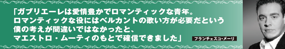 「ガブリエーレは愛情豊かでロマンティックな青年。 ロマンティックな役にはベルカントの歌い方が必要だという 僕の考えが間違いではなかったと、 マエストロ・ムーティのもとで確信できました」 フランチェスコ・メーリ