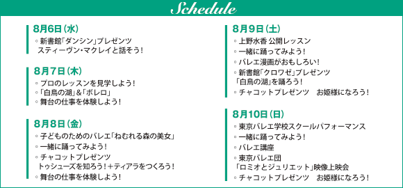 子どもから大人まで、夏は目黒でバレエざんまい! 8月6日(水)~8月10日(日)めぐろパーシモンホール 予約がなくても楽しめる 「観る」「踊る」「楽しむ」「学ぶ」のすべてを体験できるさまざまな催しが満載の〈めぐろバレエ祭り〉。 注目のイベントをピックアップしてご紹介します。