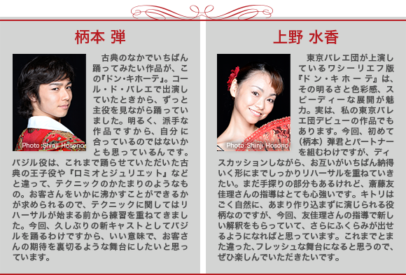 柄本 弾 古典のなかでいちばん踊ってみたい作品が、この『ドン・キホーテ』。コール・ド・バレエで出演していたときから、ずっと主役を見ながら踊っていました。明るく、派手な作品ですから、自分に合っているのではないかとも思っているんです。バジル役は、これまで踊らせていただいた古典の王子役や『ロミオとジュリエット』などと違って、テクニックのかたまりのようなもの。お客さんをいかに沸かすことができるかが求められるので、テクニックに関してはリハーサルが始まる前から練習を重ねてきました。今回、久しぶりの新キャストとしてバジルを踊るわけですから、いい意味で、お客さんの期待を裏切るような舞台にしたいと思っています。 上野水香 東京バレエ団が上演しているワシーリエフ版『ドン・キホーテ』は、その明るさと色彩感、スピーディーな展開が魅力。実は、私の東京バレエ団デビューの作品でもあります。今回、初めて(柄本)弾君とパートナーを組むわけですが、ディスカッションしながら、お互いがいちばん納得いく形にまでしっかりリハーサルを重ねていきたい。まだ手探りの部分もあるけれど、斎藤友佳理さんの指導はとても心強いです。キトリはごく自然に、あまり作り込まずに演じられる役柄なのですが、今回、友佳理さんの指導で新しい解釈をもらっていて、さらにふくらみが出せるようになればと思っています。これまでとまた違った、フレッシュな舞台になると思うので、ぜひ楽しんでいただきたいです。