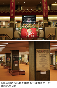 会場のロビーのいたるところに、東京バレエ団の50年の歴史を物語る国内外公演ポスターが展示されました。なかには日本のバレエ史にいまも語り継がれているマーゴ・フォンテイン主演「眠れる森の美女」(1973年)やパリ・オペラ座ガルニエ宮での「ザ・カブキ」初演(1986年)のポスターなどもあり、バレエ・ファンの方々からは、あらためて東京バレエ団の輝かしい歴史を感じるとの声が聞かれました。