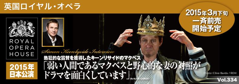 近年、イギリスを代表するバリトン、サイモン・キーンリサイドはヴェルディ作品へとレパートリーの重心を移し、素晴らしい成功をおさめている。特に『ドン・カルロ』のロドリーゴ、『椿姫』のジョルジョ・ジェルモン、『ファルスタッフ』のフォード、『リゴレット』と『マクベス』のタイトルロールでは絶大な賞賛を得ている。『マクベス』は、ウィーンで初めて歌った(2009年)後、ベルリン(2013年)、ミュンヘン(2014年)の舞台にも立った。英国ロイヤル・オペラのフィリダ・ロイド演出には2011年のロンドンに続き、日本公演にも出演することとなった。