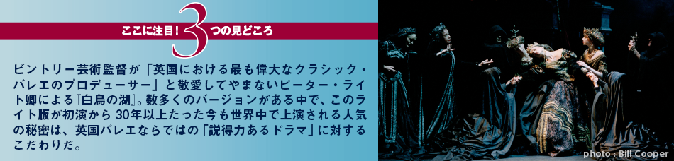 ここに注目!3 つの見どころ。 ビントリー芸術監督が「英国における最も偉大なクラシック・バレエのプロデューサー」と敬愛してやまないピーター・ライト卿による『白鳥の湖』。数多くのバージョンがある中で、このライト版が初演から30年以上たった今も世界中で上演される人気の秘密は、英国バレエならではの「説得力あるドラマ」に対するこだわりだ。