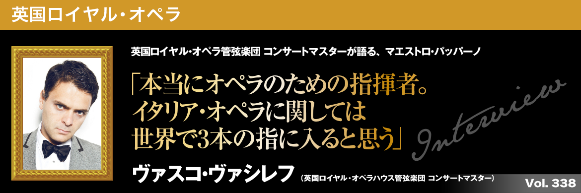 ヴァスコ・ヴァシレフが音楽監督ハイティンクに見出され、英国ロイヤル・オペラハウス管弦楽団のコンサートマスターに指名されたのは1993年、23歳の時だった。もちろん最年少である。パッパーノ監督下の演奏では、2002年の『ヴォツェック』が初めてだ。ブルガリア生まれでモスクワ、ロンドン等の音楽学校を卒業、リヨン歌劇場を経て現職へ。オペラ、バレエの演奏に加えて英国ロイヤル・オペラ(ROH)内外の様々な音楽プロジェクトを主宰し、ポップ風、エスニック風等ジャンルを超えた幅広い活動を行っている。独自の来日公演もある。
