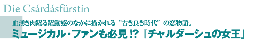 メリー・ウィドウ』初演から10年後の1915年、第一次大戦勃発でそれどころではないはずのウィーンで、またまたオペレッタの大ヒット作が生まれた。カールマン作曲の『チャルダーシュの女王』だ。第一次大戦前の〈古き良き時代〉を背景に、ブダペストで人気沸騰の歌姫シルヴァとウィーンの貴族エドウィンとの身分違いの恋の物語が進行する。このカップルのほかに、エドウィンの親友のボニ伯爵、ウィーンの貴族の令嬢シュタージ、狂言回し的な役割を演ずるブダペストの粋な遊び人フェリ・バチといった人物たちが絡んでの、紆余曲折に富む恋のさや当ての物語。最後はもちろん、シルヴァとエドウィン、シュタージとボニの2組のカップルが成立してのハッピーエンドだ。