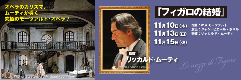 オペラのカリスマ、ムーティが導く 究極のモーツァルト・オペラ! 『フィガロの結婚』 11月10日(木) 11月13日(日) 11月15日(火) 作曲:W.A.モーツァルト 演出:ジャン=ピエール・ポネル 指揮:リッカルド・ムーティ