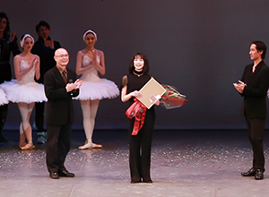舞台上のスクリーンに、印象に残る数々の舞台が映し出された後、舞台中央で飯田宗孝東京バレエ団団長より、在団26年の間に残した功績が紹介され、「特別団員」の証書と花束が贈られました。