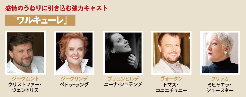 ワーグナー作品のなかで最も悲劇色の濃い人物といわれるジークムント役のクリストファー・ヴェントリスは、美声のワーグナー・テノールとして注目の人。バイロイトでも活躍するベテラン、ジークリンデ役のペトラ・ラングとの間で繰り広げられるのは陶酔的な愛の世界です。ジークムントの強い愛によって、彼に死を、と命じられたブリュンヒルデも父ヴォータンへの翻意を決意するのです。ブリュンヒルデのこの決意は、神々の長ヴォータンの怒りを買うとともに、父娘間に猛烈な苦悩をもたらします。ブリュンヒルデ役は、女性がもつあらゆる感情表現の演じ分けが長丁場にわたって要求される究極のドラマチック・ソプラノでなければなりません。ニーナ・シュテンメのブリュンヒルデはウィーン国立歌劇場はもとより、ミラノ・スカラ座やバイエルン国立歌劇場など、目下この役で世界最高といわれるもの。圧倒的な迫力と感動をもたらします。そして、この壮大な物語の根源に立つヴォータン。神々の長であり、世界制覇の野望をもちながらも、『ワルキューレ』では、ジークムントの父、フリッカの夫、ブリュンヒルデの父としての感情に翻弄されます。ヴォータン役のトマス・コニエチュニーは、当代きってのドラマチック・バス・バリトン。強靭さと繊細さを併せ持つ、その声と表現力によるヴォータン役の素晴らしさはすでに実証されています。このほか、ワーグナー・オペラでは常に圧巻の存在感を放つミヒャエラ・シュースターによるフリッカ役も、ヴォータンならずとも抗えない強力なキャスト!
