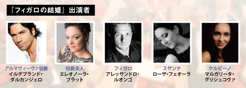 『フィガロの結婚』出演者 アルマヴィーヴァ伯爵 イルデブランド・ダルカンジェロ 伯爵夫人 エレオノーラ・ブラット フィガロ アレッサンドロ・ルオンゴ スザンナ ローザ・フェオーラ ケルビーノ マルガリータ・グリシュコヴァ