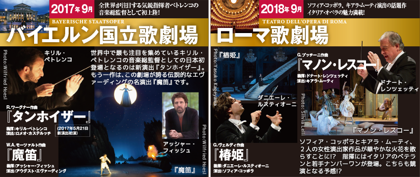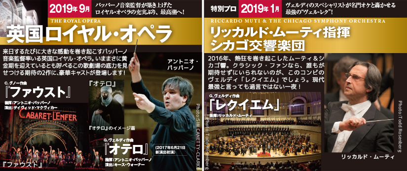 日本のオペラ・ファンにとってはすでに定着している〈オペラ・フェスティバル〉シリーズ。2017年から2019年には、3つの歌劇場に、特別プロとしてリッカルド・ムーティ指揮シカゴ交響楽団の「レクイエム」が加わる4団体7演目。どの公演も見逃すことのできない魅力的なラインナップです。