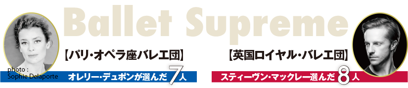 パリ・オペラ座バレエ団と英国ロイヤル・バレエ団、それぞれのカンパニーの選りすぐりのダンサーが登場する〈バレエ・スプリーム〉。この共演は、個々のダンサーの共演であるとともに、二大バレエ団が華やかに火花を散らす舞台でもあります。オレリー・デュポンが選んだ7人、スティーヴン・マックレーが選んだ8人、それぞれの魅力を、舞踊評論家の柴田明子さんに紹介してもらいました。