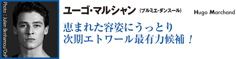 長身に甘いマスク。舞台のどこにいても自然と目が追ってしまうのがユーゴ・マルシャンだ。入団してまだ6年ながら、すでに「マノン」「ロミオとジュリエット」などに主演し好評を博している。次期エトワール最有力候補の一人だ。