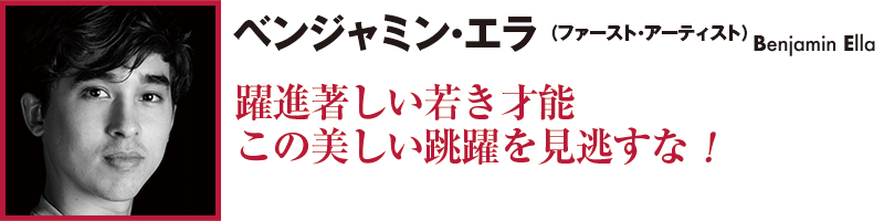 ユース・アメリカ・グランプリで銀賞を受賞したとき、美しい跳躍や躍動感が評されたベンジャミン・エラ。その後英国ロイヤル・バレエ団に入団し、昨年の来日公演では「ジゼル」のペザントなどを踊った。これからが楽しみなダンサーだ。