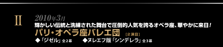 創立348年の伝統を誇り、世界の頂点を極めるバレエの殿堂、パリ・オペラ座バレエ団が2つの豪華な全幕物を携えて来日します。その一つ「ジゼル」は、19世紀にこのバレエ団によって初演されたロマンティック・バレエの傑作。もう一つの「シンデレラ」は、巨星ヌレエフが、設定をハリウッドに替えて映画界のスター誕生の物語として描いた華やかな舞台。パリ・オペラ座の圧倒的な実力と洗練された魅力をたっぷり味わってください。