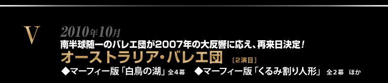 英国バレエの伝統を受け継ぎ、南半球随一の規模と実力をもつオーストラリア・バレエ団が、グレアム・マーフィー振付の2作を携えて早くも再来日。洗練されたステージで、再び旋風を巻き起こします! 古典の名作を故英国皇太子妃ダイアナの悲劇になぞらえた話題作「白鳥の湖」を、前回公演直後からの熱いリクエストにお応えして再演するほか、実在のバレリーナをモデルにした創意あふれる「くるみ割り人形」をお贈りします。