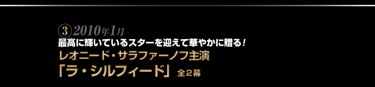 あどけない少年の面影を残す容姿で鋭いテクニックを軽やかにこなし、一陣の風のように舞台を駆け抜けるレオニード・サラファーノフ。人気急上昇中のスターが、東京バレエ団自慢のレパートリー、ラコット版「ラ・シルフィード」に登場します。華麗なステップの数々が繰り広げられるシルフィードたちの森に、飄々として小気味よいサラファーノフ旋風が巻き起こる舞台は見逃せません!