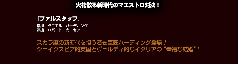 今回上演されるのは、天才演出家ロバート・カーセンによる新演出版。「黒か白か、ではないことが“笑い” には必要」と語るカーセンは、『ファルスタッフ』にはシェイクスピアの英国的な面とヴェルディの音楽がもつイタリア的な面の両方がジャグリングしていることを観て欲しいと考えています。1950 年代後半という舞台設定も、このドラマに、貴族の黄昏と新興中産階級の台頭といった伏線があることを、観客がより受け取りやすくできるように考えられたものでしょう。
