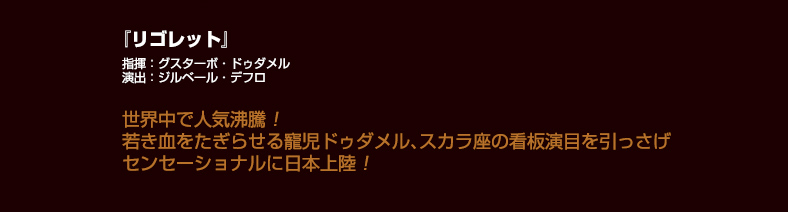 ※「リゴレット」については、当初〈オペラ・フェスティバル〉ちらし、ホームページ等でリュック・ボンディの新演出版の予定とお知らせしましたが、ミラノ・スカラ座の意向によりジルベール・デフロ演出版に変更になりました。なにとぞご了承ください。