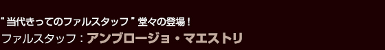 1970年イタリアのパヴィア生まれ。ヴェルディの諸役を中心に世界中で活躍していますが、なかでもファルスタッフは最大の当たり役。ヴェルディ没後100年の2001年には、スカラ座によるヴェルディの生地ブッセートで大統領臨席のメモリアル公演が開催されましたが、ここでファルスタッフを演じたマエストリは、柔らかな声と豊かな表情・演技で、大成功をおさめ、一躍“当代きってのファルスタッフ”として、すでにウィーン国立歌劇場、バイエルン国立歌劇場、ベルリン・ドイツ・オペラ、チューリッヒ歌劇場ほか、ヨーロッパの主要な歌劇場に登場しています。今回上演されるロバート・カーセン演出は、英国ロイヤル・オペラとスカラ座の共同制作ですが、マエストリはロンドンでもミラノでも初演キャストのファルスタッフ。この役にこの人あり!と、聴衆をうならせるはず。