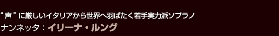 ロシア出身。2003年から05年までミラノ・スカラ座アカデミーで研鑽を重ねたルングは、チャイコフスキー国際コンクール、エレナ・オブラスツォワ・コンクール、ヴェルディの生地ブッセートの“ヴェルディの声”など、数々の国際コンクールでの受賞歴をもつ若手実力派ソプラノです。スカラ座ではムーティ指揮の『モーゼとファラオ』、新演出の『マリア・ストゥアルダ』ほかに出演していますが、なかでも、2007年には、マゼール指揮『椿姫』でアンジェラ・ゲオルギューの代役としてヴィオレッタを演じ、好評を博しました。“声”に厳しいパルマ、ローマなどを中心とした活躍の場が、近年ウィーン、ベルリン、エクサン・プロヴァンスなど、ヨーロッパ各地へと広がっています。“天使のような無邪気さ”を感じさせるリリコ・レッジェーロの声が要求されるナンネッタ役で、日本のファンにその魅力を披露します。