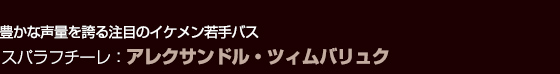 1976年ウクライナのオデッサ生まれのアレクサンドル・ツィムバリュクの名を、2007年チャイコフスキー国際コンクール第1位入賞者として記憶されている方もいるかもしれません。日本でも入賞者が登場するコンサートが開催されました。 “シャリアピンの再来”と言われるほどの豊かな声量をはじめ、広い音域や情感にあふれた表現力を持つ注目の若手バスです。今シーズンは、バイエルン国立歌劇場に『ボリス・ゴドゥノフ』のタイトルロールでのデビューをはじめ、メトロポリタン歌劇場で『オテロ』のロドヴィーコ、スカラ座では『リゴレット』のほかに『ジークフリート』と『ラインの黄金』のファーフナーを、さらにバレンボイム指揮により行われるスカラ座のモスクワ公演では、『ドン・ジョヴァンニ』の騎士長で出演と、世界に活躍の場を広げています。舞台栄えのする長身、黒髪となかなかのイケメンで、人気沸騰の予感!