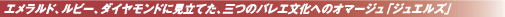 第1幕〈エメラルド〉は、フォーレの「ペレアスとメリザンド」「シャイロック」にのせ、ひざ丈の緑の衣裳で優雅に舞う、19世紀前半にフランスで開花したロマンティック・バレエへのオマージュ。第2幕、ストラヴィンスキーの「ピアノと管弦楽のためのカプリッチョ」にのせて、赤いミニでダイナミックに踊る〈ルビー〉は、バランシーンがジャズやミュージカルの魅力を吸収しながら活動した、アメリカのバレエへのオマージュ。そしてチャイコフスキーの「交響曲第3番」にのせて、白のクラシック・チュチュで格調高く華やかに踊る〈ダイヤモンド〉は、バランシーンの故国ロシアのクラシック・バレエへのオマージュなのです。