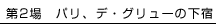 | 父親へ手紙を書いているデ・グリュー。マノンはその手を止めさせて、自分がどれほど彼を愛しているかを告げる。デ・グリューが手紙を出しに行っている間に、レスコーがムッシューG.M.を連れて現われる。マノンはG.M.の誘いを受け入れる。デ・グリューが戻ると、レスコーは、マノンとG.M.の関係に目をつぶれば全員が金持ちになれるのだと説く。 |