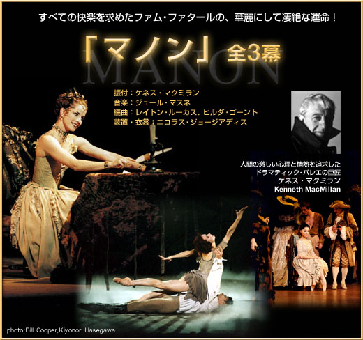アシュトンの後を継いでロイヤル・バレエ団の芸術監督となったケネス・マクミランは、それまでのバレエでは法度ともいえる、人間のリアルな心理をドラマティックに描いた傑作を数々発表しました。18世紀フランスの華麗にして退廃した社会を映し出すアベ・プレヴォーの原作による『マノン』は、その代表作。とりわけ第1幕でマノンとデ・グリューの出会いと愛の高まりを、第2幕で二人の行き違う心情を、そして第3幕沼地での非業の最期を描くパ・ド・ドゥは、恋人たちの波乱に満ちた運命を紡ぐ踊りとして傑作の誉れ高く、ガラ公演でもたびたび上演されます。欲望をかきたてる誘惑に満ちた社会の中で、良心と道徳心の欠如のうちに自らの魅力だけを頼りに生き、運命に翻弄されてゆく少女の物語は、現代の観客の心に突き刺さる感動を呼びます。