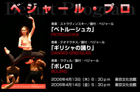 ディアギレフ・プロとベジャール・プロをつなぐのは「ペトルーシュカ」です。フォーキン振付の「ペトルーシュカ」初演(1911年)から、ベジャール振付の「ペトルーシュカ」初演(1977年)まで、66年の歳月が流れています。この2つの「ペトルーシュカ」を比較すれば、時代の変化とともに、20世紀のバレエの移り変わりが如実に感じ取れるはずです。 |