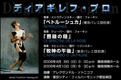また、これまで何度もベジャール版「ペトルーシュカ」を踊ってきた首藤が、フォーキン版を演じるのも大きな話題です。演劇作品への出演経験から、ペトルーシュカの悲哀が際立つ舞台になるでしょう。さらに、木村和夫が「バラの精」を演じるのも見逃せません。木村和夫のアカデミックで、詩的な踊りは、まさにこの役に打ってつけ。ウェーバーの「舞踏への招待」の音楽が、そのまま踊りで表現されていることを実感されるはずです。100年前のパリの観客になった気分になって、目の前に繰り広げられる舞台に迷い込んでみてはいかがでしょうか。 |