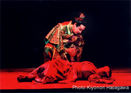 「以前に西洋の演出家によるものをいくつか観たとき、そのいずれもが全体に色彩トーンが暗いという印象をもちました。おそらくそれは、西洋の方から見た東洋の神秘的な部分の表現のためだったのでしょうけれど。私の映画をご覧いただいてもわかるとおり、私は鮮やかな色、鮮烈な色、そういう濃厚なものが好きなのです。ですから、まず、そうしたところから、自分の演出を作っていこうと考えました。それから、もうひとつの考え方として、オペラと中国の京劇の通じる部分というものを考えました。人間の心情が音楽とともに描き出されるということでの共通性ですね。そして、京劇もまた、とても色鮮やかな世界だということ。これが最初のアイディアといえますね」 |