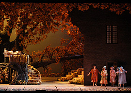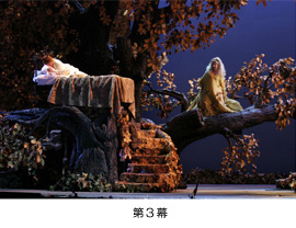 その白眉となるのが最終幕。ロンコーニの演出により、マルゲリータ・パッリの舞台美術は、ベッドで眠るファルスタッフ一人を残して、一瞬のうちにかき消え、自然の風景が現れる。秋の森の魔法にかかったかのように、樫の木の上で眠りつづけるファルスタッフ。じつに美しい演出だった。 |