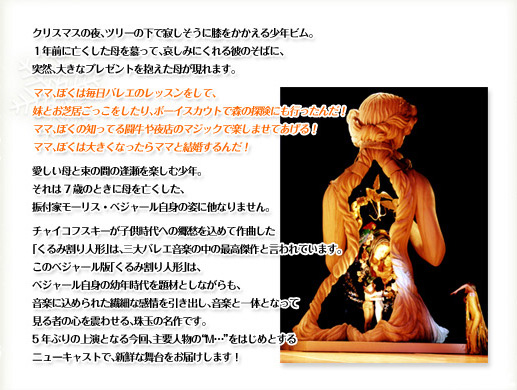 1998年10月、ベジャール・バレエ団によってイタリアのトリノ・ダンスフェスティバルのオープニングに初演されたモーリス・ベジャールの新作は、観客や批評家たちを少なからず驚かせました。20世紀の舞踊界にさまざまな革新をもたらした現代バレエの巨匠ベジャールが、よりによって、誰もが知るチャイコフスキーの名曲にのせたクラシック・バレエの代表作「くるみ割り人形」を題材に取り上げたからです。