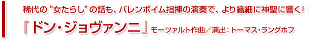 世紀の色男を主人公とした『ドン・ジョヴァンニ』は、モーツァルトのオペラのなかでも3本の指に入る人気作品。すでに日本でも数々の演出が上演されてきましたが、ここで上演されるのは人間の感情を繊細に描き、ドラマの深みを堪能させることで定評をもつトーマス・ラングホフが手がけた舞台です。今では当代随一の指揮者として世界に認められているダニエル・バレンボイムですが、実は彼のオペラ・デビューは『ドン・ジョヴァンニ』だったのです。常に高い音楽的要求をもち続けてきたバレンボイムですが、この作品にはそうした背景もあって、格別な思い入れがあるようです。バレンボイムが厳選した実力派歌手が揃えられていることにも注目。バレンボイムの『ドン・ジョヴァンニ』は必聴、必見です。