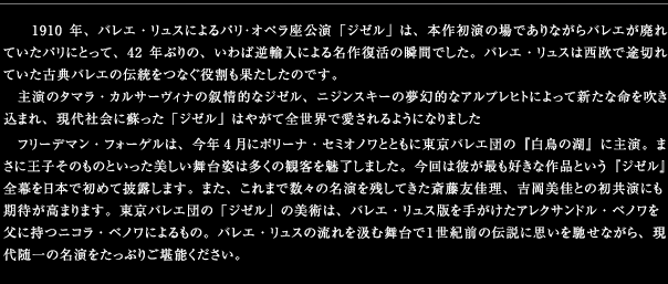 海外での客演も多く、05年には高岸直樹とともにリトアニア国立オペラ・バレエ劇場80周年ガラで『椿姫』パ・ド・ドゥ、セルビア国立劇場で『ジゼル』を踊った。セルビア国立劇場にはその後も06年5月と12月に『ジゼル』に主演し、セルビアの観客からの熱い賞賛が与えられた。 |