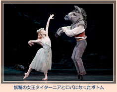 豊かなマイム、オベロンや妖精パックの妙技、みなぎるユーモアと、見所にはこと欠かず、とりわけ人間から驢馬に変わっていく職人ボトムの踊りの楽しさといったらない。しかし、何といってもこの作品を支えているのは、全編にあふれる超自然的な情感といえよう。夫婦の諍いであれ、もつれた男女の仲であれ、動物への変身であれ、妖精というこの世ならぬものが絡んだ物語なのだ。すべてがおさまるところにおさまったあと、夜想曲にあわせて踊られるオベロンとタイターニアのパ・ド・ドゥは、調和と幻想が溶け合った魅惑に輝いている。 |