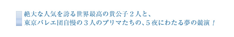 今、世界のバレエ界で、その芸術性とスターの光輝がともに比類なきものと絶賛されるマニュエル・ルグリとウラジーミル・マラーホフ。この2人の貴公子が、古典バレエの傑作『ジゼル』を日替わりで演じるという、夢の競演が実現します!