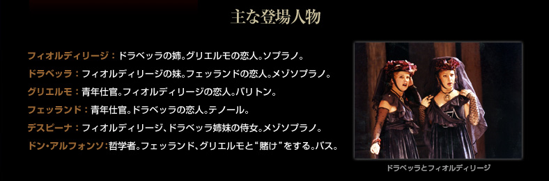 デスピーナは、フィオルディリージとドラベッラに、貞淑と浮気とを使い分けて「恋人がいないなら楽しみなさい」と勧める(〈女が十五になれば〉)。はじめはあきれていた姉妹だが、まずデスピーナが浮気もまんざら悪くないと言い始め、つられるようにフィオルディリージも、気が滅入って死ぬよりは楽しんだほうがいいのでは、と思い始める。そうなるとどっちの彼にする? 二重唱〈私はブルネットを選ぶわ〉で、ドラベッラが先に選び、次にフィオルディリージがもう一人の方を選ぶことに。姉妹はお互いに、相手の恋人を選んでいる。