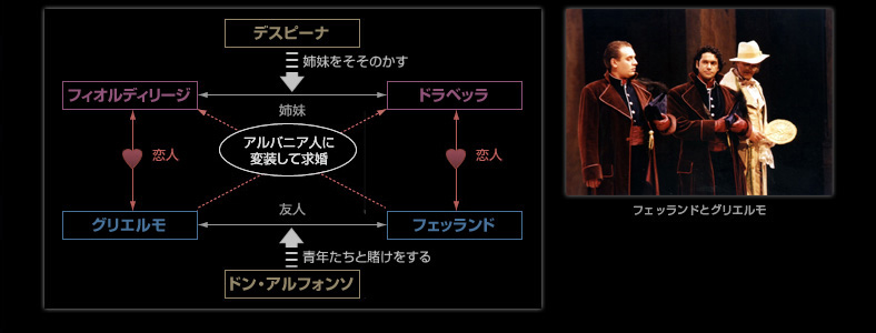 これまでの経過を知らせあうフェッランドとグリエルモ。グリエルモはドラベッラ獲得の成果を語り、フェッランドを慰めるように〈女たちは〉と、女の不実さを歌う。グリエルモの話を聞き、〈裏切られても、嘲笑されても〉と乱れた心を歌うフェッランド。ドン・アルフォンソが、いずれ丸く収まるとなだめる。