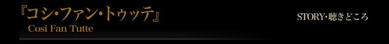 二人の青年士官フェッランドとグリエルモと、哲学者ドン・アルフォンソが女性の貞操について論議する三重唱〈僕のドラベッラだけは、そうじゃない〉でドラマは始まる。論議の内容は、許嫁のフィオルディリージとドラベッラ姉妹の貞操を堅く信じて疑わない二人の青年に対し、ドン・アルフォンソは〈女の貞操というものは〉アラビアの不死鳥のように誰も見たことがない、というもの。やりとりの挙げ句、女の貞操をめぐる賭けをすることに。自分たちの勝利を確信するフェッランドとグリエルモは、ドン・アルフォンソに従うことを誓う。(三重唱〈美しいセレナーデを〉)。